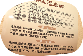 | 効能 | 神経痛、筋肉痛、間接痛、五十肩、運動麻痺、関節のこわばり、うちみ、くじき、慢性消火器病、疾病、冷え性、病後回復期、疲労回復、健康増進、動脈硬化症、やけど、切り傷、慢性皮膚病 |