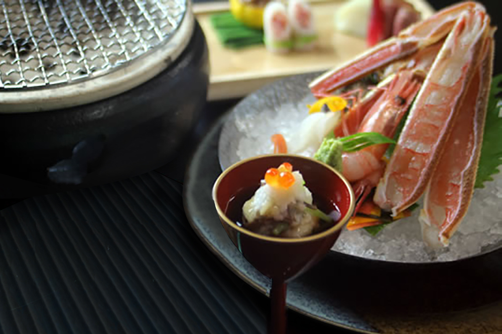 丹後には間人ガニ以外にも、良質な地蟹が多数ございます。地蟹の活ガニをお好みのメイン料理(お一人様半杯 ※2名で1杯)として、間人の新鮮な魚もお召し上がりいただけるコースです。
