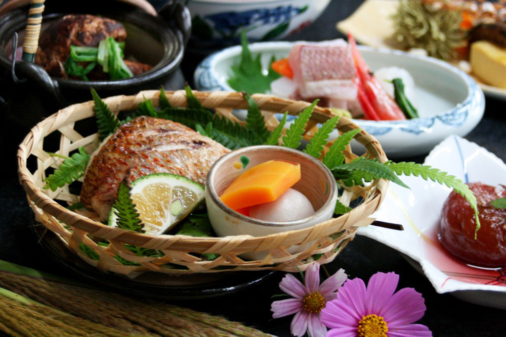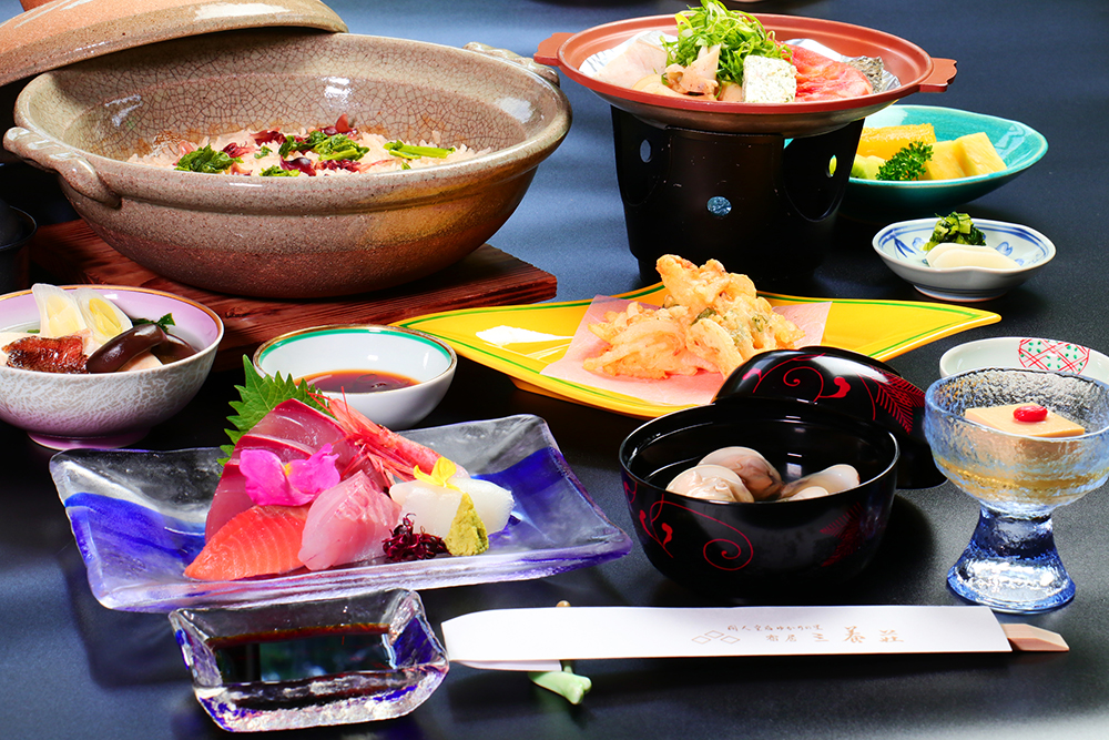 丹後の海で獲れた新鮮な魚介類と、季節ごとの旬の食材を使った季節会席。三養荘だからこそ味わえる、繊細でやさしい味付けでお楽しみください。四季折々の旬材は、食べ方・調理法でさまざまな滋味へと変化させます。どうぞ間人の色、三養荘の真髄を味わいくださいませ。