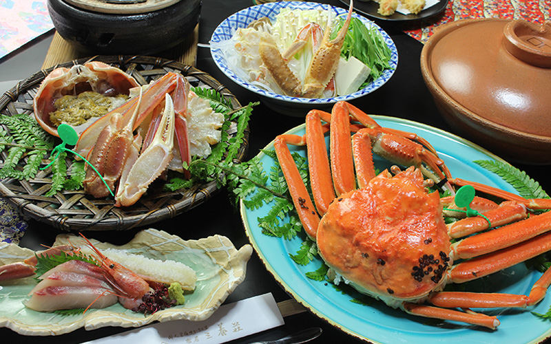 地元で獲れたズワイガニを2杯使用し、カニ刺し・湯がきガニ・カニ天麩羅・焼きガニ・カニ甲羅焼き・カニすき鍋・雑炊とフルコースでお楽しみいただけます。ズワイガニのほか、水揚げされたばかりの魚料理も。初めて丹後を訪れる方におすすめです。